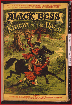 The stories themselves were reprints, or sometimes rewrites, of Gothic thrillers such as The Monk or The Castle of Otranto, as well as new stories about famous criminals. Some of the most famous of these penny part-stories were The String of Pearls: A Romance (introducing Sweeney Todd),[5] The Mysteries of London (inspired by the French serial The Mysteries of Paris), and Varney the Vampire. Highwaymen were popular heroes; Black Bess or the Knight of the Road, outlining the largely imaginary exploits of real-life English highwayman Dick Turpin, continued for 254 episodes. Other serials were thinly-disguised plagiarisms of popular contemporary literature. The publisher Edward Lloyd, for instance, published a number of penny serials derived from the works of Charles Dickens entitled Oliver Twiss, Nickelas Nicklebery, and Martin Guzzlewit.[4]