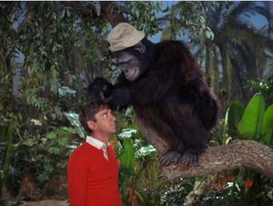 Revision as of 05:24, 5 June 2017 by Adminpeter (talk | contribs) (Created page with "thumb|300px|Gladys takes Gilligan's hat. ==Bio== '''Gladys''' is a chimpanzee native to the island, although her location on the island is a bit of a myst...")
